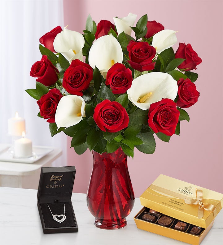 Some gifts are designed to get a reaction. This is one of them. We’ve gathered long-stem red roses with white calla lilies, creating the perfect Valentine’s bouquet for letting someone know how much you love them