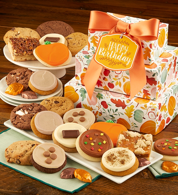 NEW Thanksgiving with a side dish of whimsy! Eighteen roses in autumnal orange, red, and yellow accompany a bright orange vase adorned with a cute illustration of a turkey face. It’s certain to charm kids and former kids alike.